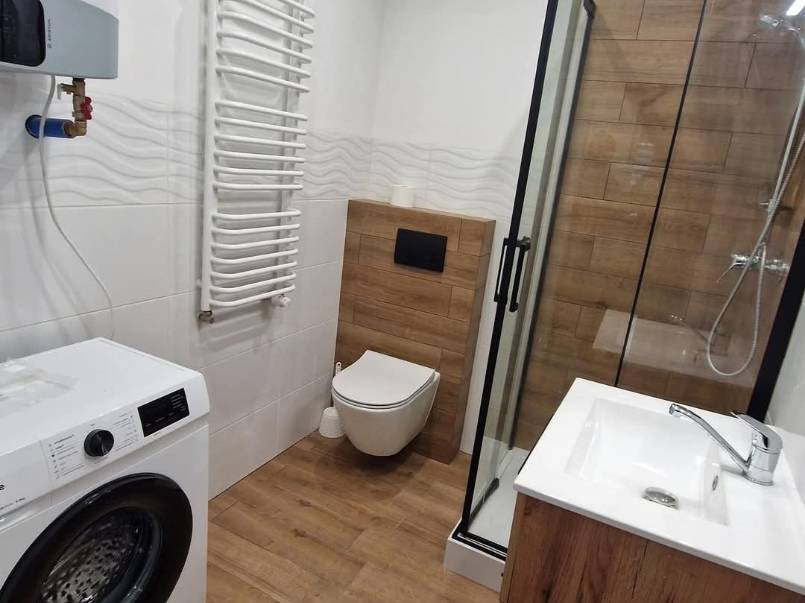 - łazienka - wyposażona w prysznic, umywalkę, pralkę, wc.