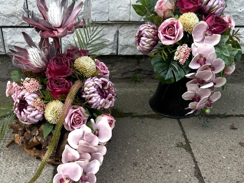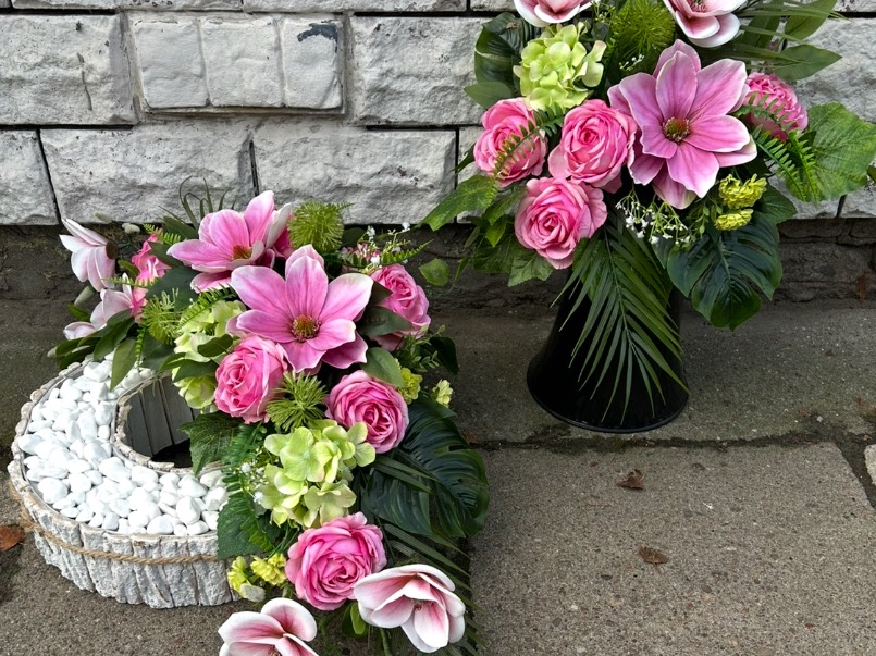 Oferuję eleganckie komplety pogrzebowe – wiązanki z bukietami, wykonane z trwałych, wysokiej jakości kwiatów. Każda kompozycja jest ręcznie robiona, estetyczna i przygotowana tak, by zachowała piękny wygląd na długo.